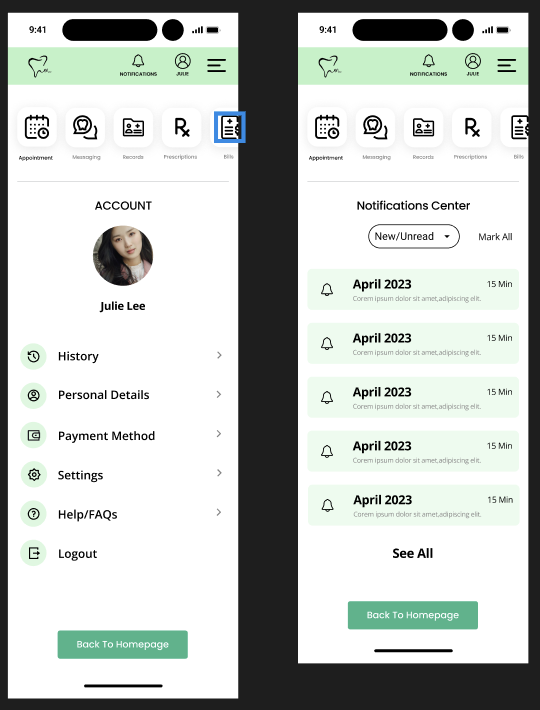 Should there be a chance to bring this prototype to life, I would like to incorporate the billing and prescriptions features so as to further eliminate the need for users to spend time calling their dental office or visiting them in-person, and ensuring the convenience of managing their dental care at the tips of their fingers.